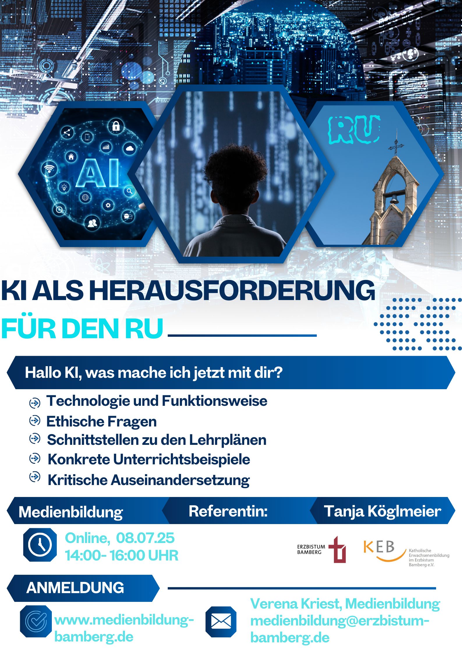 Künstliche Intelligenz durchdringt zunehmend unseren Alltag und wirft grundlegende Fragen auf - auch für den Religionsunterricht. Doch welche sind das genau? Genau darum soll es in dieser Veranstaltung gehen.